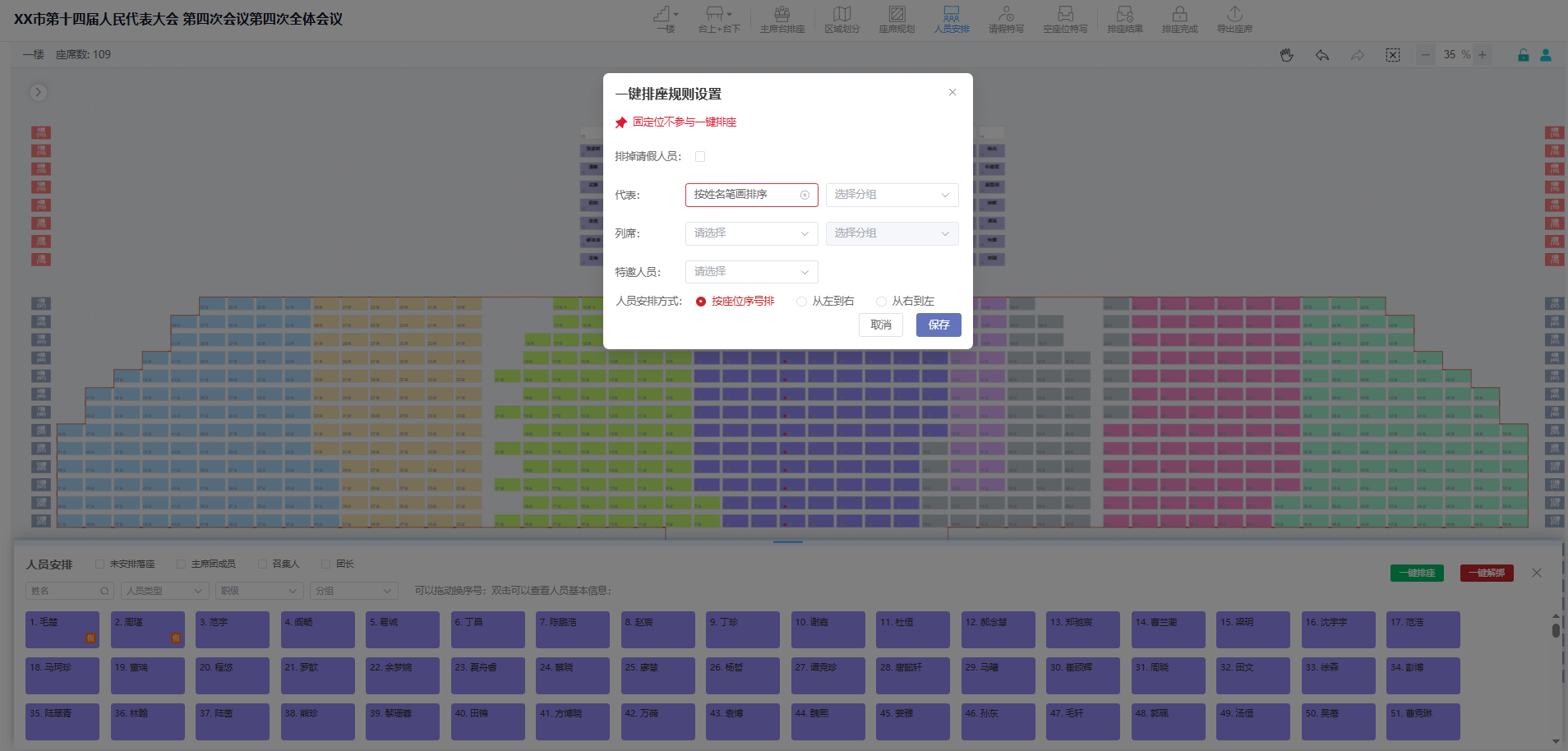 智能排座系统严格遵循代表团划分、召集人统筹、姓氏笔画顺序等原则,兼顾监票人等特殊角色席位需求,自动完成精准排座,彻底解决了传统人工排座繁琐、易错等问题。系统一键补位功能可快速响应人员临时调整,保障会场秩序井然,让会议组织更有精度、更有温度。